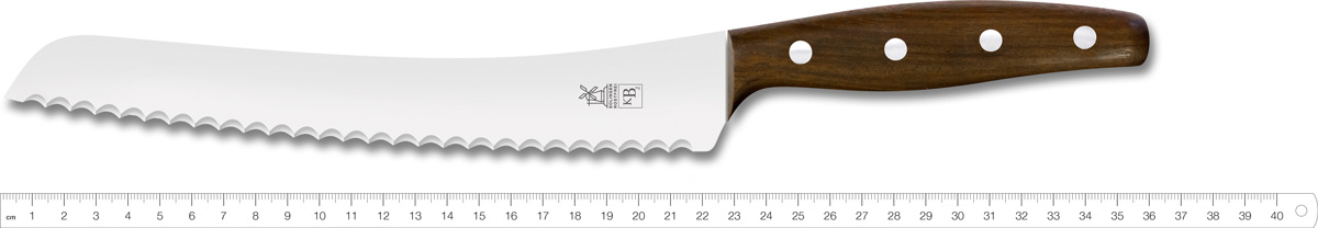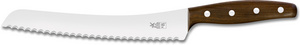 Unsere Brotsäge K B2 hat einen von Hand auspolierten beidseitigen Wellenschliff. Sowohl Rechts- als auch Linkshänder können gleichmäßig damit schneiden. Das Messer bleibt in der Schneidflucht.