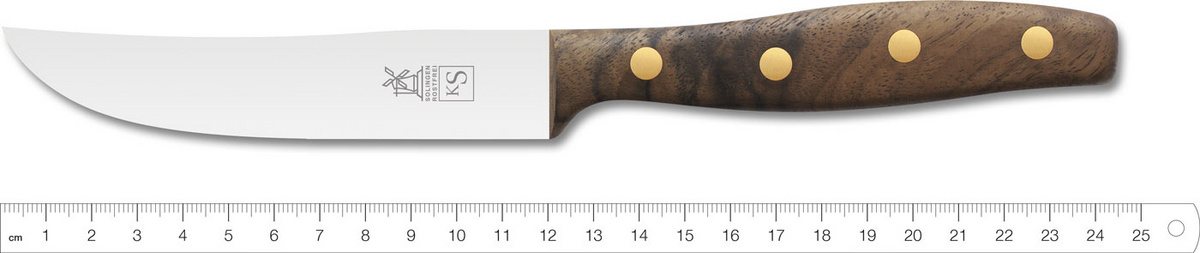 Das breite Steakmesser ist ein Messer mit einem kräftigen ovalen Griff, welcher sich beim Schneiden großer Steaks, wie T-Bone oder Brisket perfekt in die Hand schmiegt. Die Klinge wird nach alter Windmühlenmesser-Tradition nach dem Prinzip des „Solinger Dünnschliffes“ in sorgfältiger Handarbeit ausgeschliffen. Die rostfreie Klinge ist entweder klassisch mit glatter Schneide, oder mit Sägeschliff erhältlich. Der rustikale wohlgeformte Griff besteht aus Walnusswurzelholz. Er wird mit vier Messing Nieten montiert und aus der freien Hand ausgearbeitet.